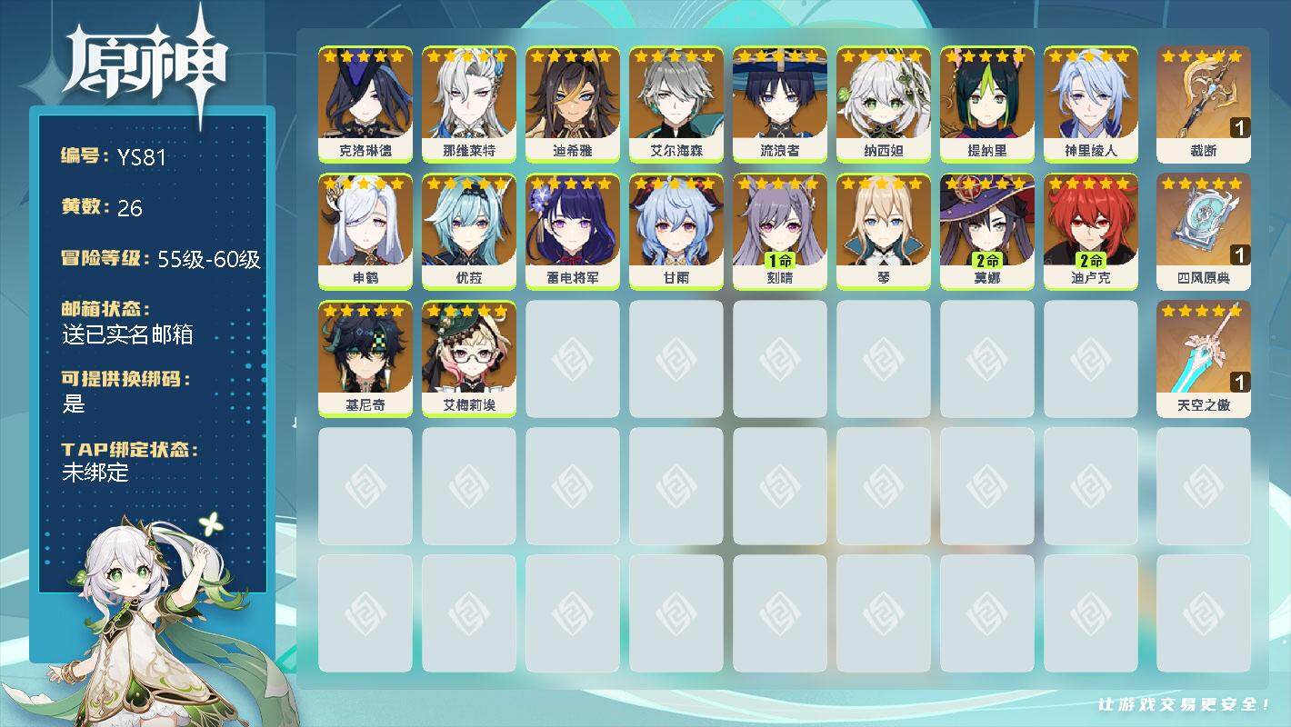 【原神】【FT50794】冒险等级:55,女主,五星数量:12,五星角色:钟离|达达利亚|枫原万叶|纳西妲|提纳里|莫娜|刻晴|赛诺|迪希雅__四星角色:班尼特 * 1命|香菱 * 4命|行秋|久岐忍 * 1命|莱依拉 * 4命|菲谢尔 * 4命|芭芭拉 * 1命|早柚 * 2命|北斗 * 1命|凝光 * 2命|托马 * 5命|鹿野院平藏 * 4命|坎蒂丝|诺艾尔 * 5命|迪奥娜 * 1命|砂糖|辛焱 * 2命|烟绯 * 1命|绮良良 * 1命|柯莱|珐露珊 * 4命|米卡 * 1命|琳妮特 * 2命|菲米尼|嘉明__五星武器:冬极白星|天空之脊|阿莫斯之弓,【邮箱未实名】,(可提供替换信息,大手机绑定虚拟手机)