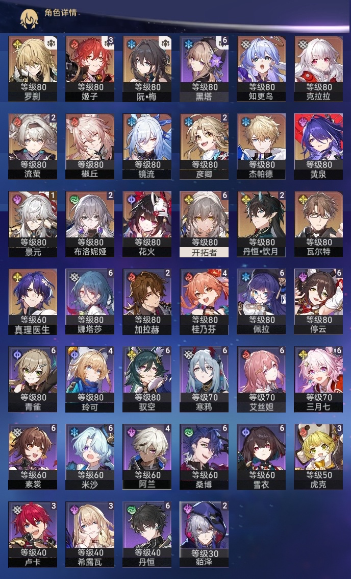 【崩坏·星穹铁道】冒险等级:70,女主,五星数量:32,五星角色:姬子 * 3命|流萤 * 2命|彦卿 * 2命|布洛妮娅 * 2命|丹恒·饮月 * 2命|景元 * 1命|罗刹|阮·梅|知更鸟|克拉拉|椒丘|镜流|杰帕德|黄泉|花火|瓦尔特|真理医生__五星光锥:记一位星神的陨落 * 5精|梦应归于何处|比阳光更明亮的|此身为剑|如泥酣眠|如泥酣眠|拂晓之前|银河铁道之夜|游戏尘寰|镜中故我|但战斗还未结束|但战斗还未结束|行于流逝的岸|时节不居|棺的回响__绑定情况:手机号,【邮箱不出售】,(可提供替换信息,邮箱不出售)
