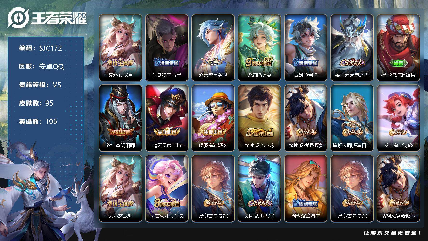 安卓QQ [5391674]实名: 可修改 性别: 男号 贵族等级: V6 英雄数: 76 皮肤数: 73 传说皮: 游龙清影 限定皮: 山海·碧波行,鸣野蒿,陌上桑