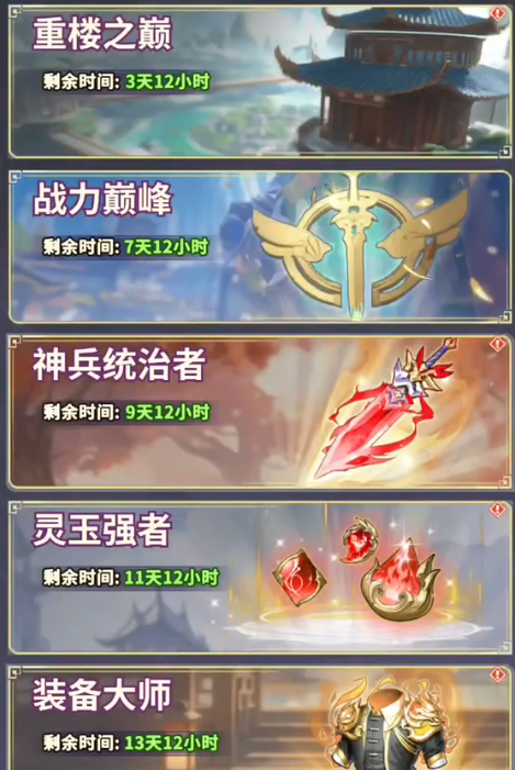 在拿的过程中,有时间还可以去打一下神兵统治者、装备大师和灵玉强者这三个活动,这三个中前两个会给到高级装备和神器,这其中神器是一种属性增幅类型的道具,有了之后全队的属性都能提升,高级装备的话就不用多说了,就是给金色品质武将装备的,可以大幅度提升战力。大家在爬完塔以后就可以去给这些装备、神器刷一刷,随后刷完后战力上去后就可以继续去推主线了,然后有了灵玉就去抽,为自己麾下补充新鲜血液,之后无限滚雪球就可以了。