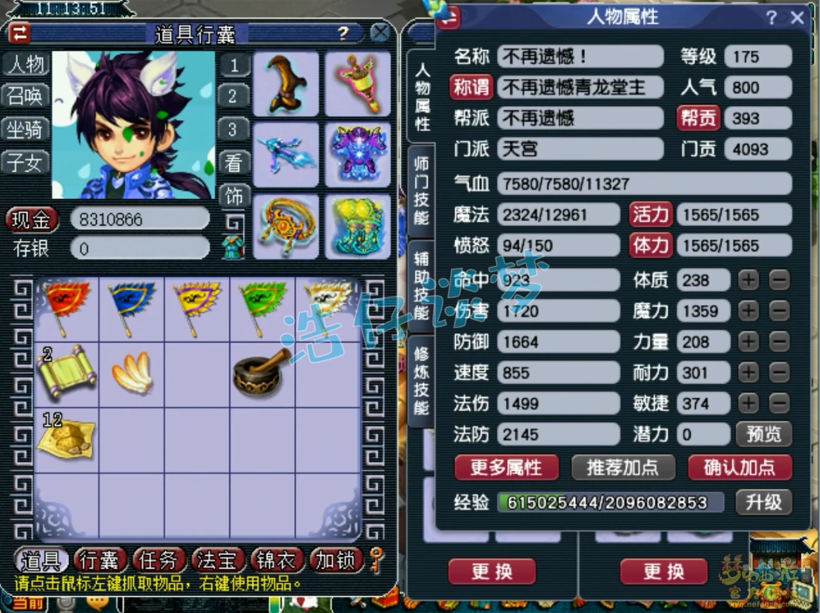穿160级体敏双加56点铠甲,镶13级光芒石提气血,葫芦套装增强生存。