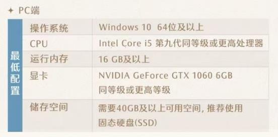 那么这一配置具体是要有什么样的水平?小编就在这里罗列出来。首先,玩家需要win10及以上的64位系统。在cpu方面,要有Intel Core i5 第九代同等级或更高处理器。除此以外,还要有16g以上的运行内存,存储空间也要有40个g以上。在显卡上,有NVIDIA GeForce GTX 1060 6GB同等级或更高等级要求。