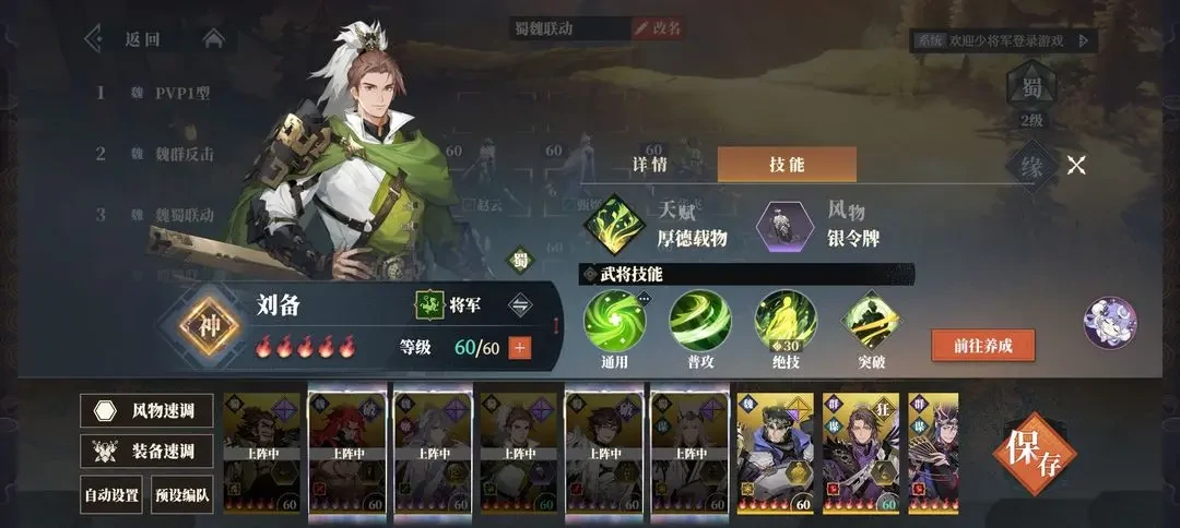 蜀魏联动反击队是当前版本热门阵容,多核输出与生存联动,在PVP对抗好用。以下是角色定位解析与实战策略: