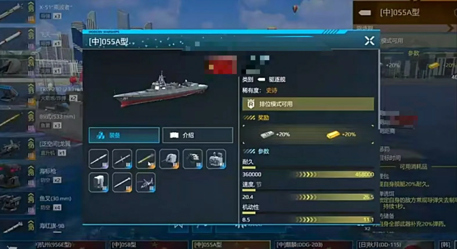 055A型驱逐舰是游戏里受关注的战斗单位,性能强!满级强化版,舰体耐久达468000,生存强。推进系统优,航速快、转向灵,方便战术机动。