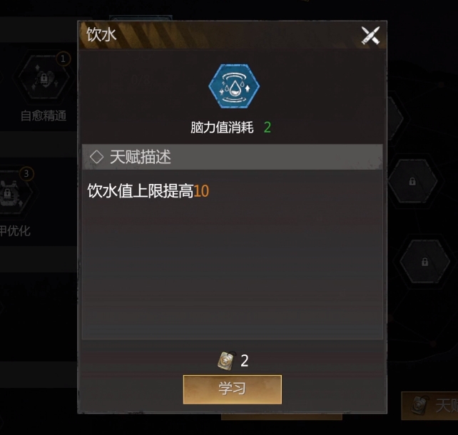 天赋的玩法其实就是给角色弥补属性上的不足,比如说包扎术能提升玩家的生命属性,饮水度能让玩家处于舒适的状态。在天赋的点击顺序只要是看玩家塑造的角色当下的各方面的属性。