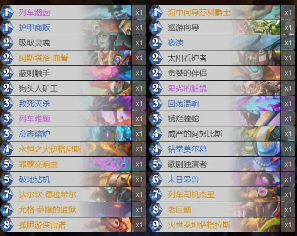 配3费卡:配致死灭杀1张,配回荡混响1张,配列车难题1张,配锈烂蝰蛇1张,配意志熔炉1张