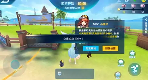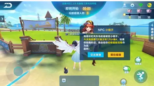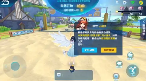 模式中,可单人挑战,也可组队游戏。系统通过小橘子发布偷猪任务。