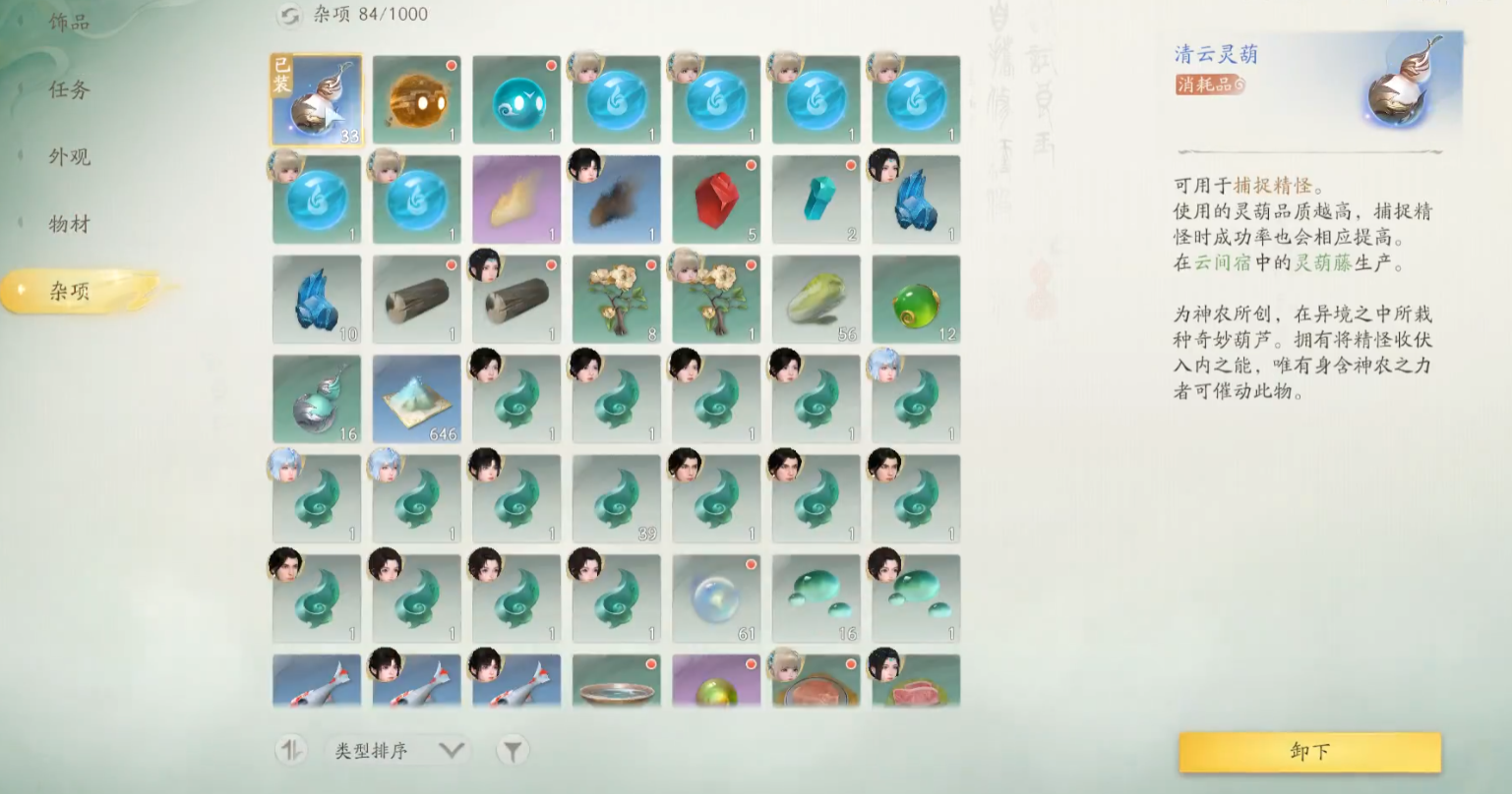 想要捕捉的话,我们可以打开背包。接着找到杂项里面的清云灵葫,这种道具可以用来捕捉宠物。若是灵葫的品质越高的话,可以捕捉到小火灵的成功率也会越高。想要获取该道具,可从云间宿里面的灵葫藤获取。