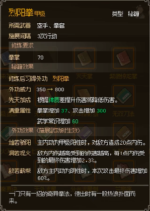 第四个是烈阳拳,这个拳法可通过走圣火宗路线来回的,通过开局选择学习的拳法或者是刻在石碑上,都可以成功拿到拳谱,这个拳法的外功威力是800,比其他的拳法功夫要高,先天加成方面的话是以体质加成为主的,第一个词条效果是如果玩家的主内功运行为甲级阳性时,可以对敌方直接造成20点的内伤,而这一词条可以看出该权法是用来打debuff的,而他的第二个词条动若观火,说明这一功法可进行自我完善,在不使用武器的状态下可对敌人造成高伤害,而且还可进行增伤。