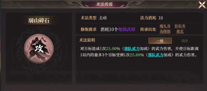 在封神开天游戏里,崩山碎石是强力群体攻击术法。玩家可通过武将传道功能,消耗特定武将获取。下面解析该术法效果和适配武将。