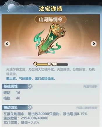 升级千里江山图器灵,暴击属性随之增长,建议优先升级。