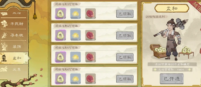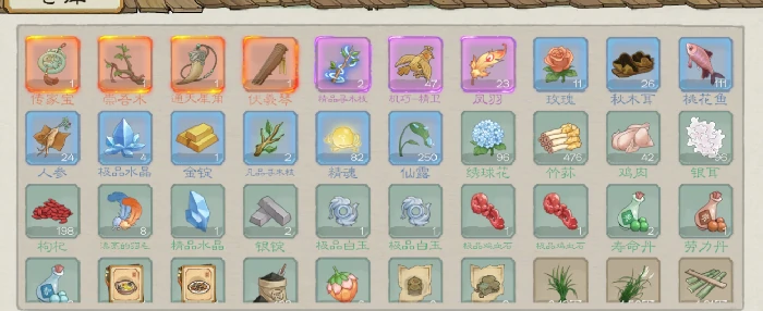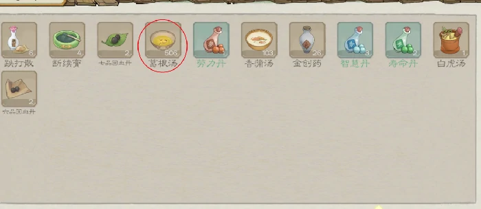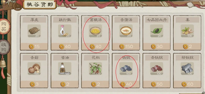 购买物资:桃谷货郎出现时,买葛根汤应急,保持500铁锭库存,每类种子储备几千个。