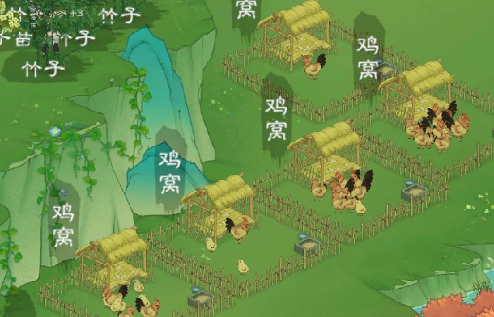 养鸡:最多建5个鸡窝,鸡苗来自森林猎人和鸡蛋孵化,保留成年鸡,春夏孵化。