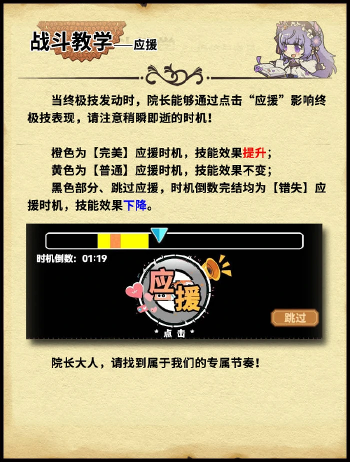 角色发动终极技能,系统给出短暂应援时机窗口,把控时机影响战斗效果。倒计时结束前,控制指针到指定区域,触发不同等级战斗加成,下面看各档位效果: