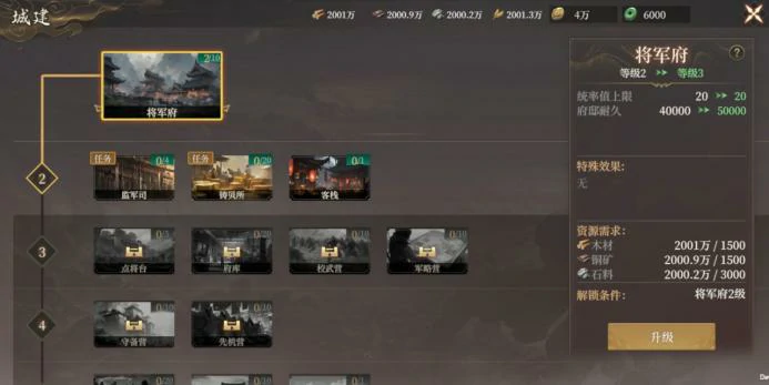 - 优先升将军府:完成新手任务,马上将将军府升到5级,解锁客栈(武将置换)、练兵所(部队获经验)、千户所(兵种升级)等设施