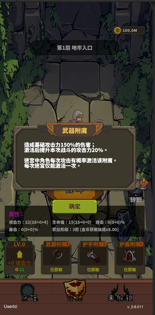 武器附魔可造成150%基础攻击力伤害,激活后提升20%本场战斗攻击力。