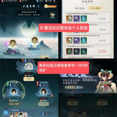 参加每日矿藏争锋活动,尽早加入排名靠前公会,留意公会占矿行动;无组织就个人完成15次占领,选高级矿点。