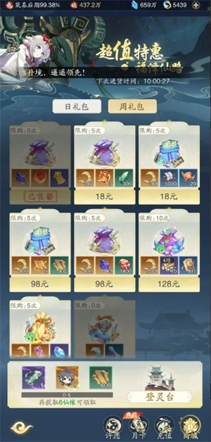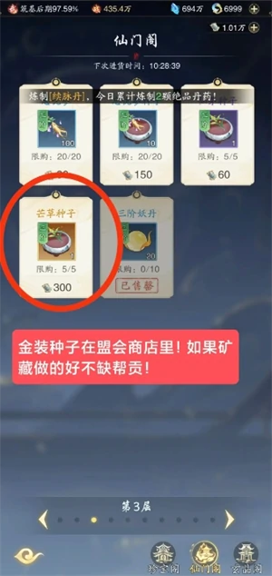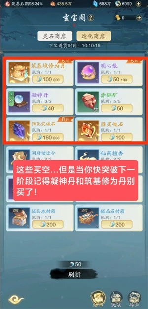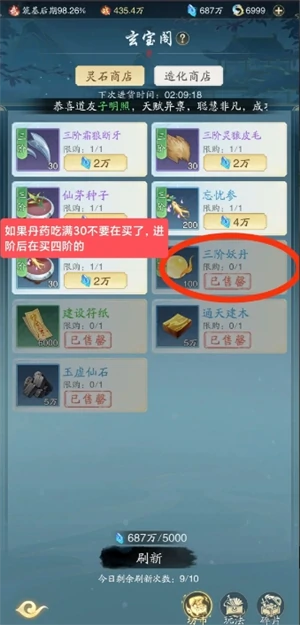 游戏前期,灵石商店建筑材料全买,三阶灵石在丹药未满30个时买满,接近突破不买种子。