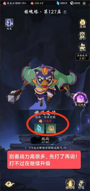 挑战镇魂塔别怕敌方战力,多尝试,不通关就提升后再挑战。