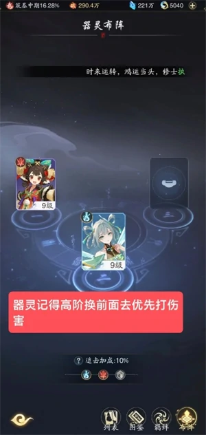 器灵配置,选三种不同职业器灵辅助,输出型器灵放前列。