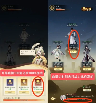 参加仙门乱斗,买100%属性加成,血量低别挑战高战力对手。