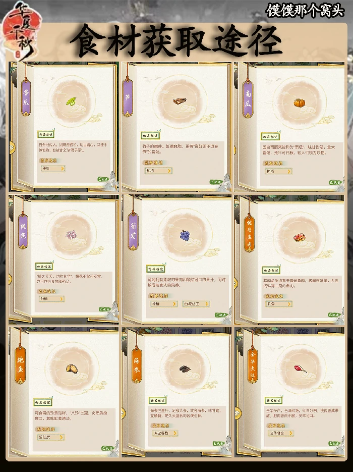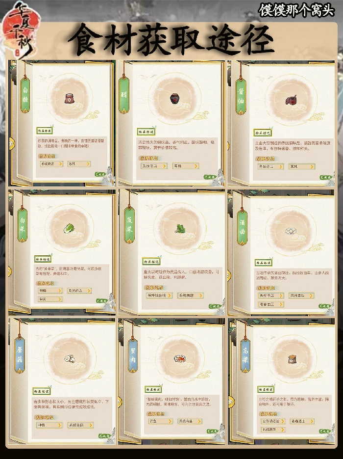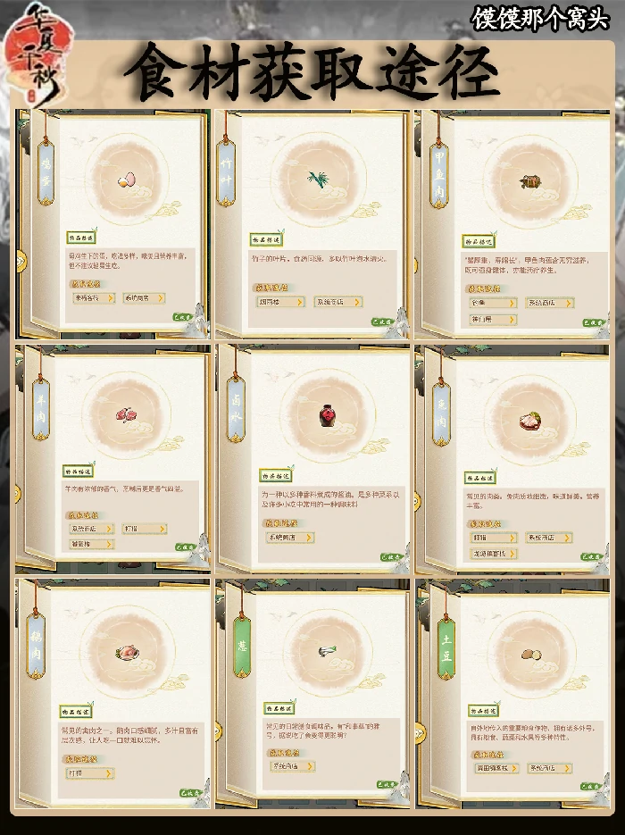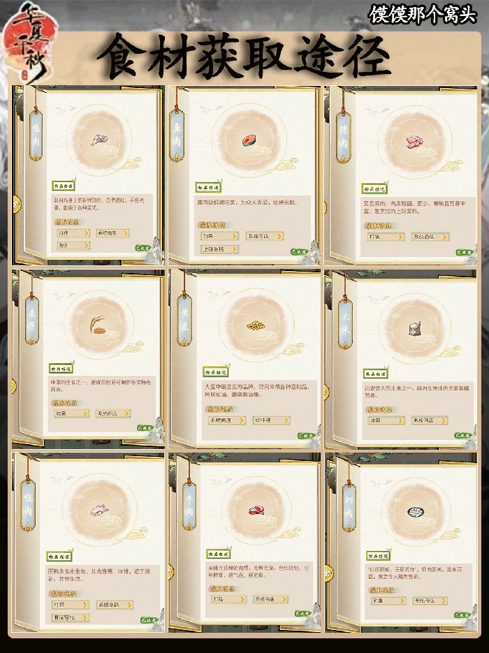 对于鸡蛋、竹叶、甲鱼肉等特殊食材,除购买外,可通过狩猎、钓鱼获取,增添游戏体验。
