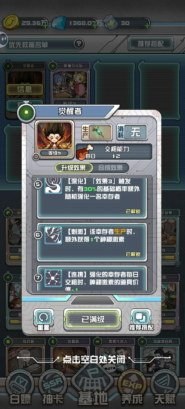 技能九是辅助技能,周边角色三星后用,以觉醒者为主力。四名三星觉醒者升四星,再合成两名五星觉醒者,形成良性循环。