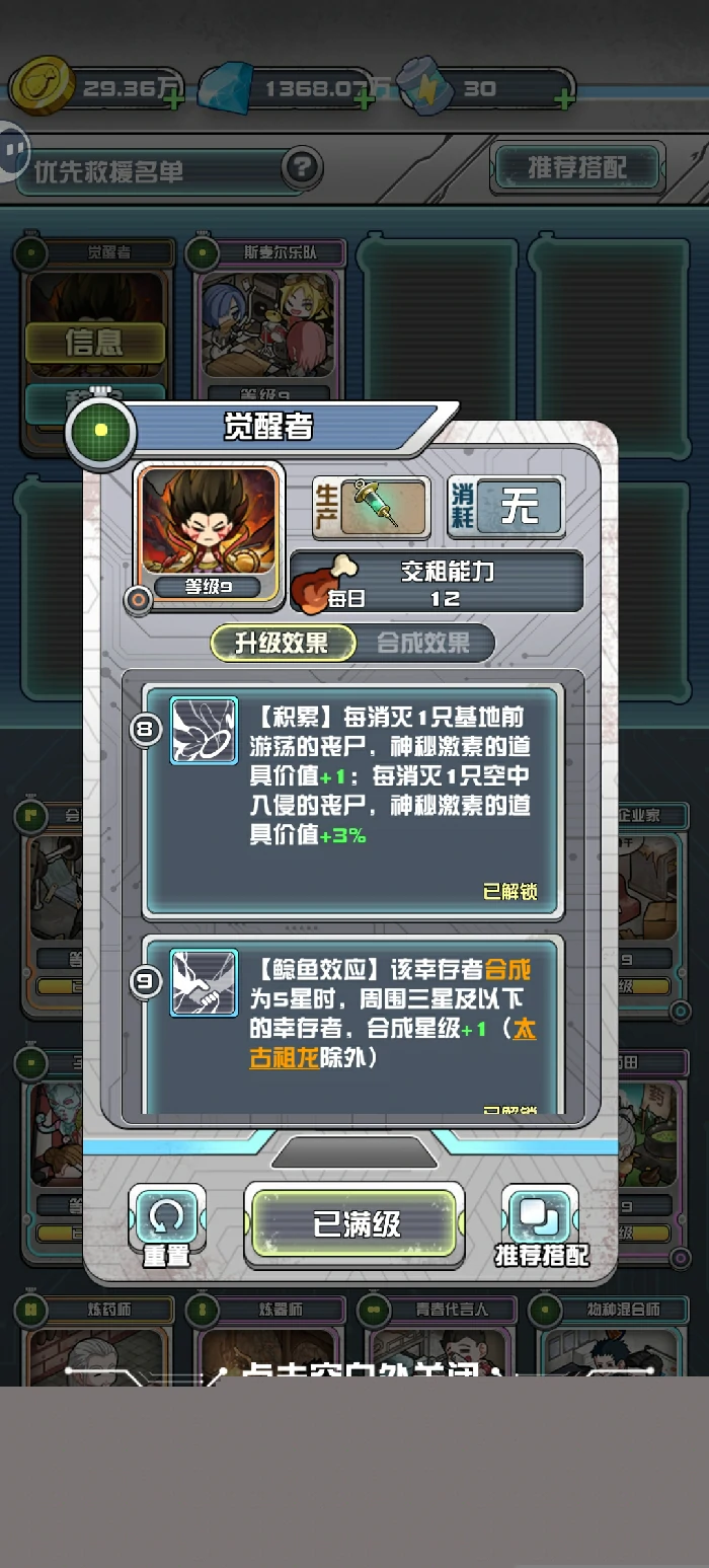 技能八解锁后角色变强,利用基地周边游荡丧尸提供百分比增益。消耗入侵丧尸影响基础丧尸来源,搭配异能“研究素材”补充丧尸数量。