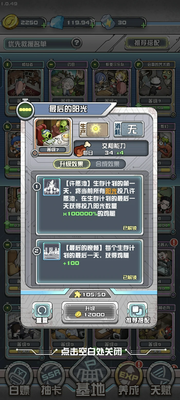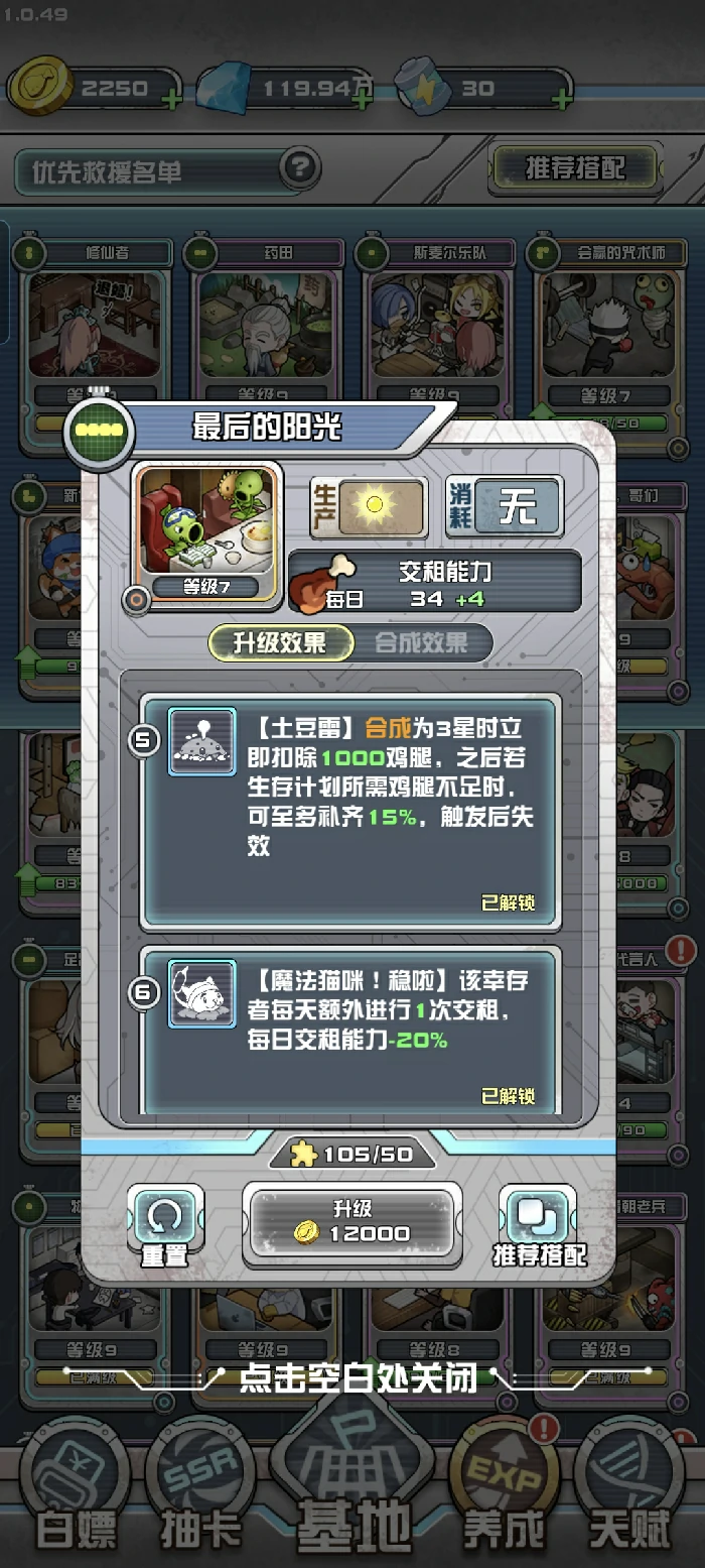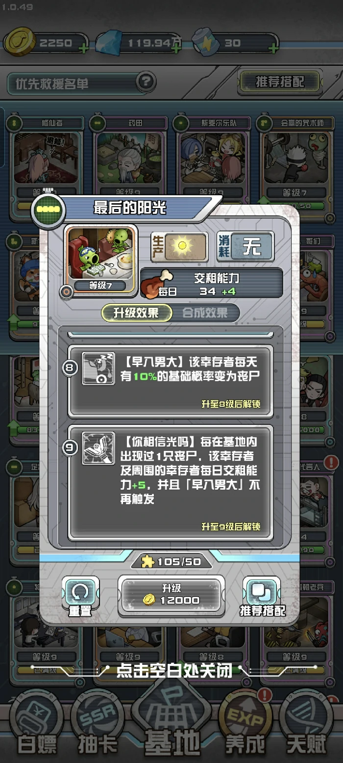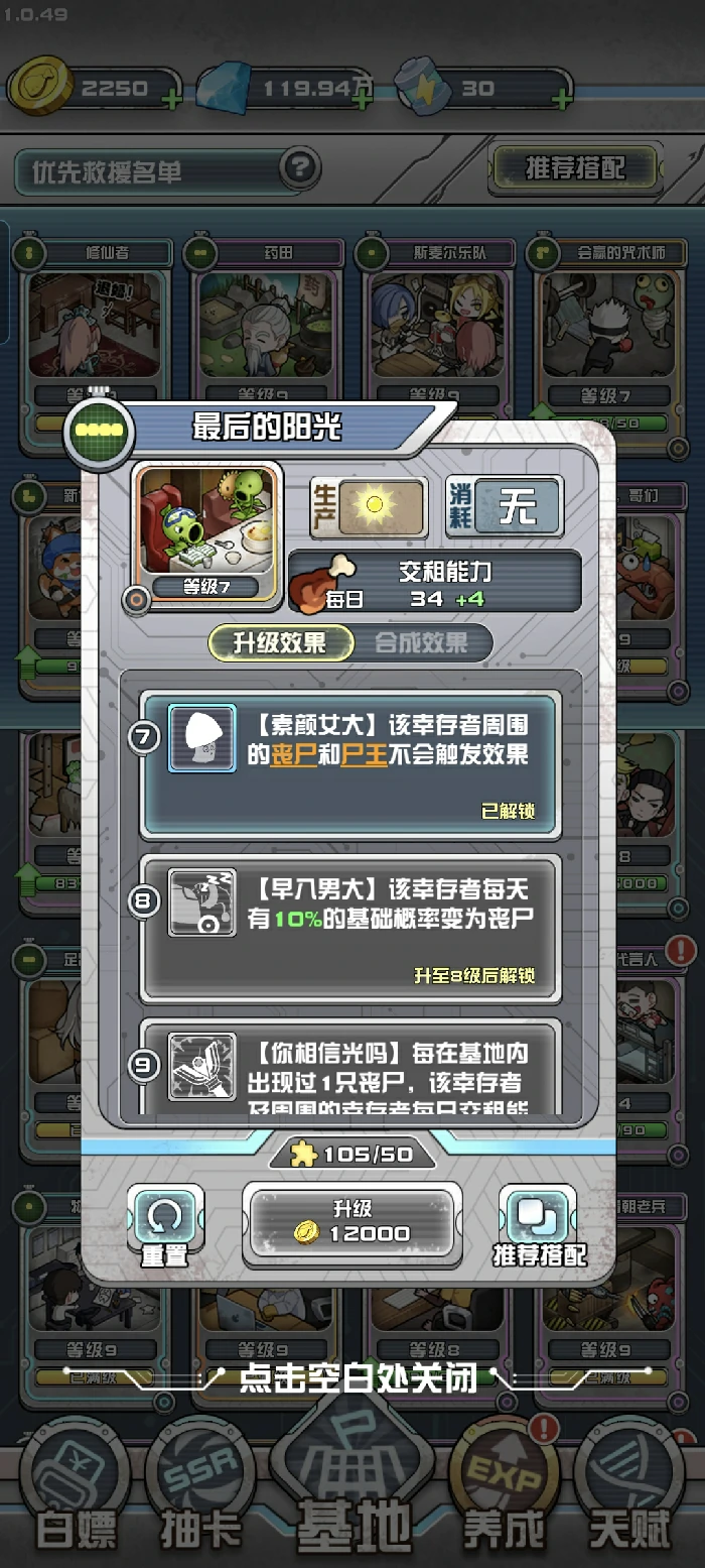 推荐将该幸存者搭配钓鱼流,尽量获取每日生产+1异变效果。先放大量低星幸存者产阳光,后期合成高星单位。