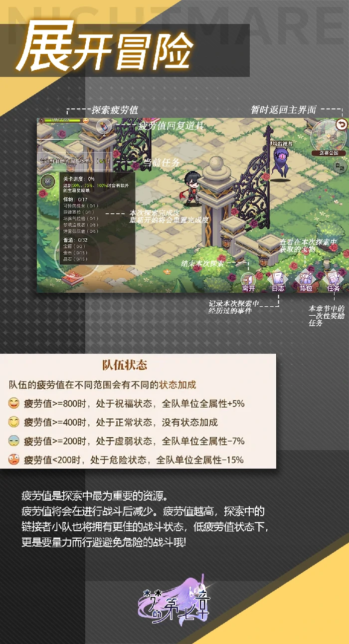 疲劳值是探索玩法核心机制。战斗结束,疲劳值减少。保持高疲劳值,链接者小队战斗更出色。疲劳值低,慎选战斗目标,防不利局面。