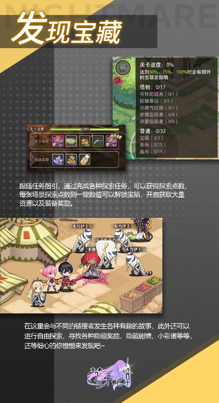 按任务提示完成探索目标,积累探索点数。场景探索点数达标,解锁宝箱,获装备、素材等奖励。