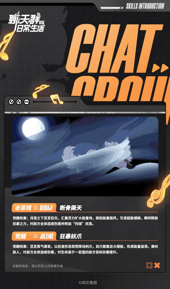 觉醒效果:豆豆爆发真气,以巨兽形态挥爪,前爪汇集爆能形成漩涡冲击敌人,伤害全体目标,目标生命值高于一定比例时额外提升伤害。