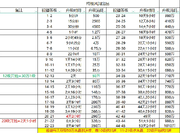 附注:写攻略时祝福20级,后续每级祝福时间增加。0氪玩家每天约40奥晶,23 - 24级奥晶与升级时间平衡,24 - 25级奥晶略多。开服33天,祝福21级,开启22级,排名20左右,加速卷约2700,公会币换加速卷,到30级祝福加速资源不缺,体验流畅。