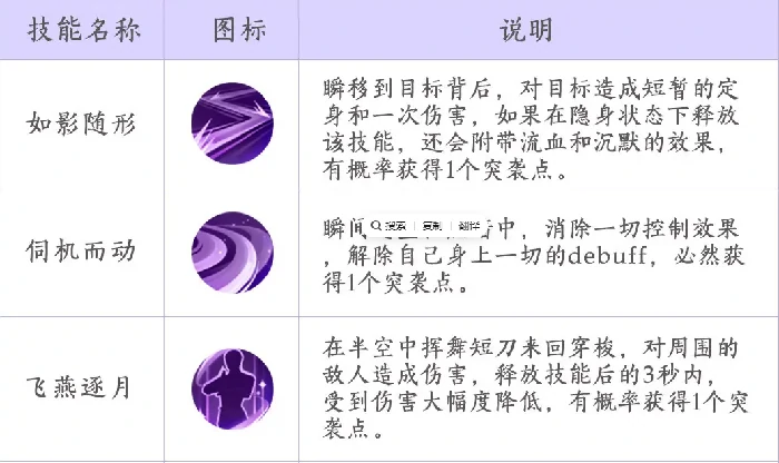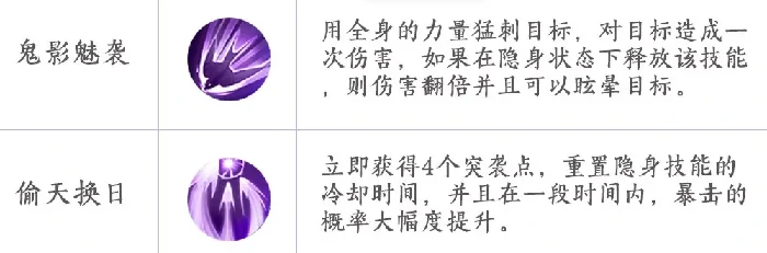 8、偷天换日:立即获4个突袭点,重置隐身技能冷却,提升暴击几率。