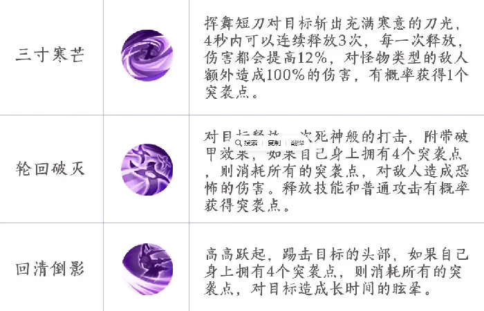 5、轮回破灭:对目标致命一击,附带破甲效果,持4个突袭点消耗造成高伤害,普攻和部分技能概率获突袭点。