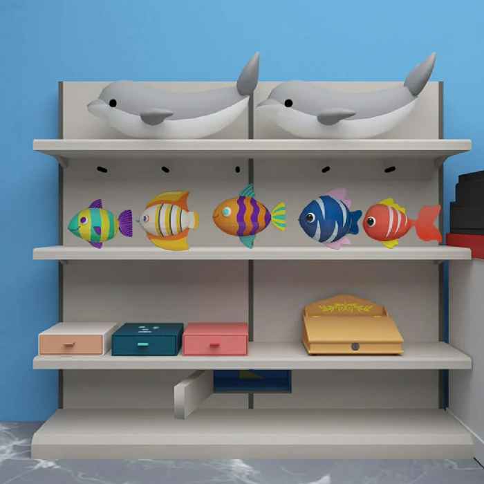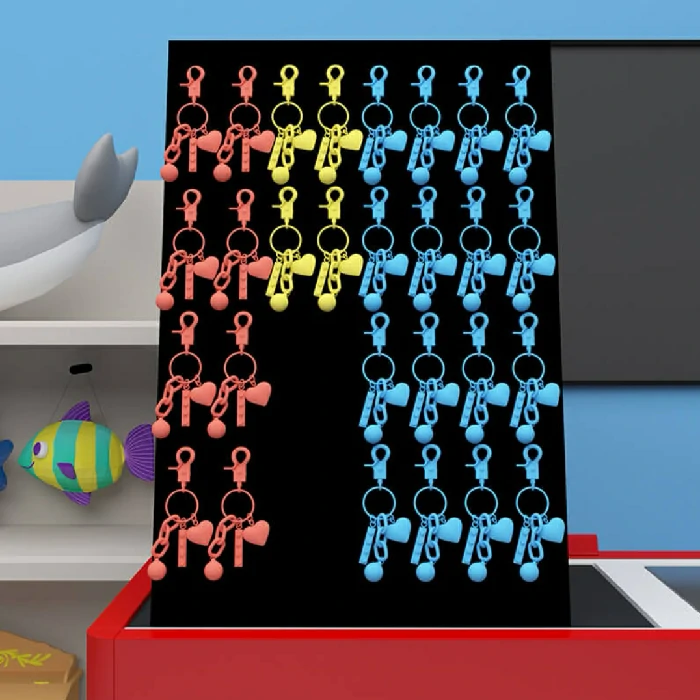 7. 倒入鱼饵到投喂口,留意鱼群饰物颜色,排列柜子鱼模型,获得另一块黄色三角积木。