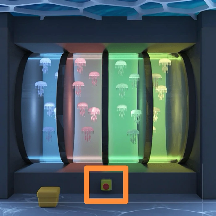 2. 用拖把清理地面污渍,记住海马出现顺序,打开企鹅展柜前黄色背包,获得红色按钮。