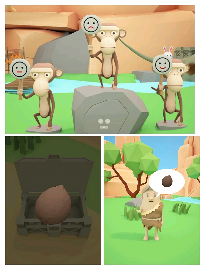 4. 结合猴子提示与罐子标记,打开③处箱子。注意猴子行为编号为12132,依序输入获绳子