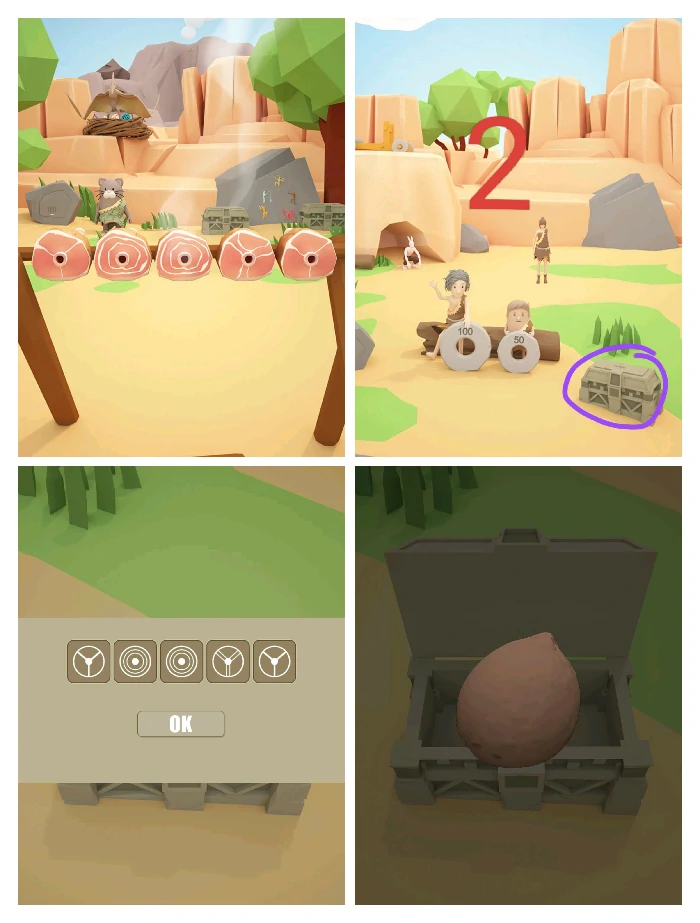 1. 观察①处石锤符号,解开③处箱子(画圈处),获石叉道具