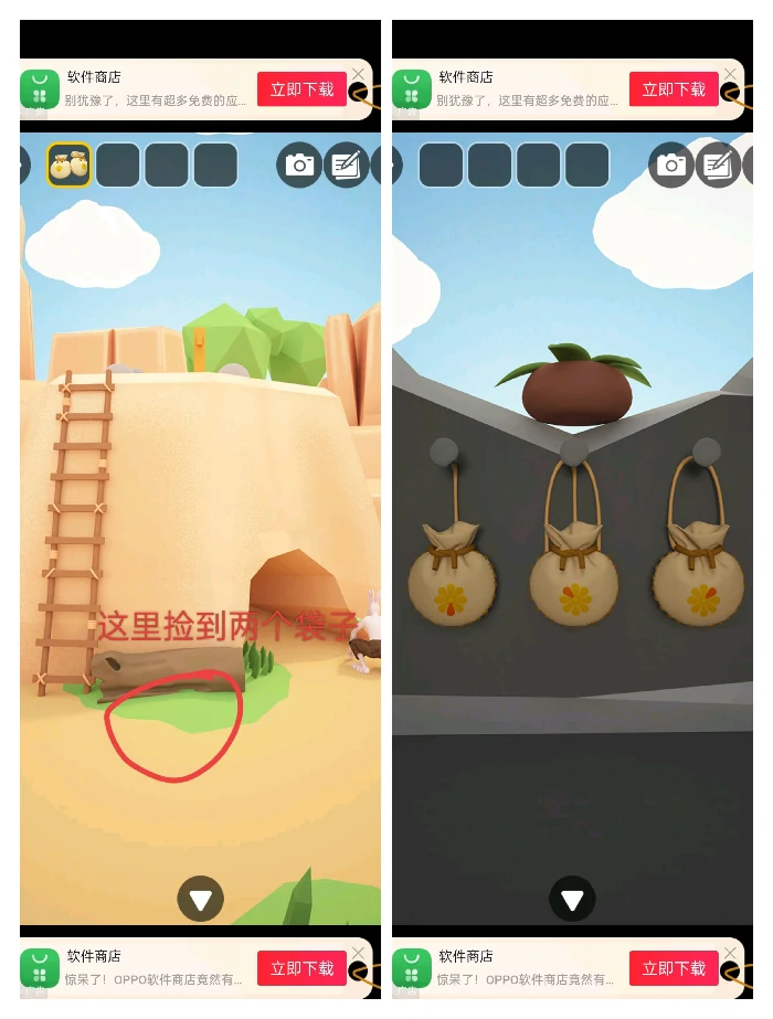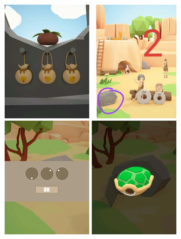 按袋上花瓣与绳子数量提示,打开②处石头,取龟壳