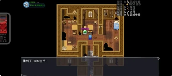 进游戏打开出生点箱子,拿初始物资(金币×1000、菜刀×1、木杖×1、木弓×1、回程卷轴×1)