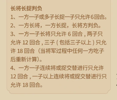 4. 一棋子长将长捉交替,最多12回合;多于一棋子执行,最多18回合。