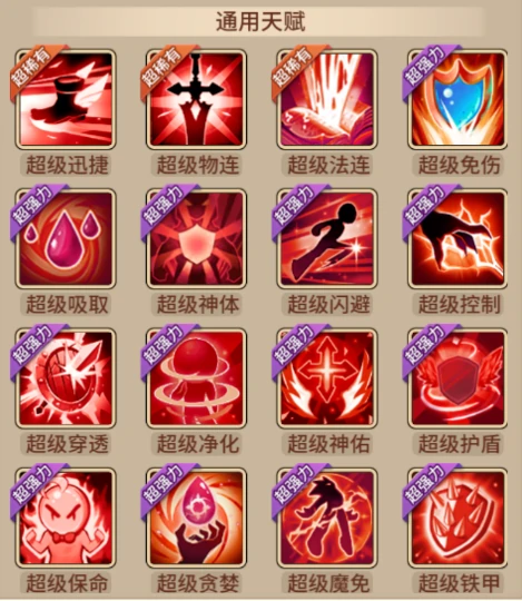包含迅捷、物连、法连、免伤、吸取、神体、闪避、控制、穿透、铁甲、魔免、英勇、暴怒、专注、爆追等48类技能