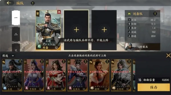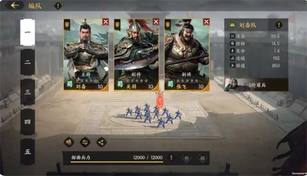 游戏基础作战单位是“部曲”,采用主将和副将协同作战模式。每支部曲有1名主将和2名副将,三名武将得属同一兵种类型,不然编不了队。
