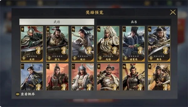 新手卡池“将星云集”奖励预览中,带“将星”标签的武将是核心武将,属性好、实力强,抽到后结合现有技能链换原有阵容里的下位武将。