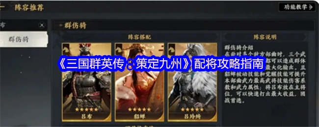 在三国群英传策定九州里,你要按不同阵营选强武将培养,再根据队伍武将数量配兵种。很多主公面对一堆武将卡牌,不知咋搭配阵容。下面这份配将攻略,你可参考。