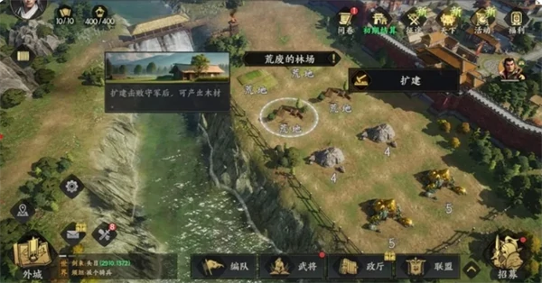 主城8级、解锁军事府前,别占粮草地,均衡争夺林场与石场;军事府建成后,逐步提高铜币资源比重。