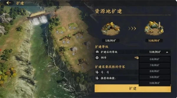 一级州中,外城资源地等级上限10级;内城资源地可扩建提升等级,实力够就能突破10级限制,获更高收益。