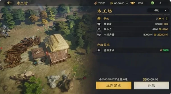 内城有四种资源建筑:磨坊产粮食、木工坊产木材、石作坊产石料、民居产铜币。消耗少量资源升级建筑,可提高对应资源每小时产量。