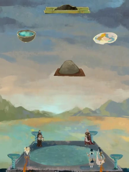 进入新场景,将鸟爪下玉盘拖到底部祭台。接着,把果实小虫拖到荷叶,等小鱼吐水三次,将荷叶移到果实上方浇水,点击左下角金色玉石继续。